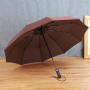 Name: 10-Rib Three-Fold Automatic Umbrella with Large Wooden Handle, Black Coated Fabric Sun Umbrella Frame: Steel, Fiberglass Canopy: Black Coated Fabric Handle: Solid Wood Handle Size: 585*10 Diameter when open: 103 cm, Length when folded: 31 cm Packaging: Matching fabric bag, matte bag packaging Quantity: 50 pieces/box Box dimensions: 45/35/30 cm Gross weight: 24 kg Single umbrella packaging size: 34*6.5*6.5 cm Weight: 0.462 kg