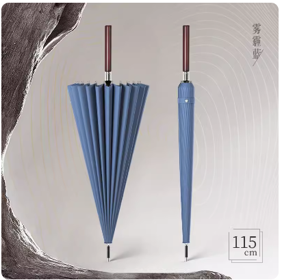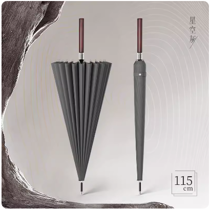 Product Name: 24-Rib Wooden Straight Handle Umbrella Frame: Fiberglass ribs, iron central shaft Canopy: Black coated fabric Handle: Wooden straight handle Specification: 685*24K Umbrella Diameter: 123CM Packaging: Individual fabric sleeve, OPP packaging Quantity per Box: 40 pieces/box Box Dimensions: 95*27*27CM Weight per Umbrella: 0.6KG Net/Gross Weight per Box: 24KG/25KG