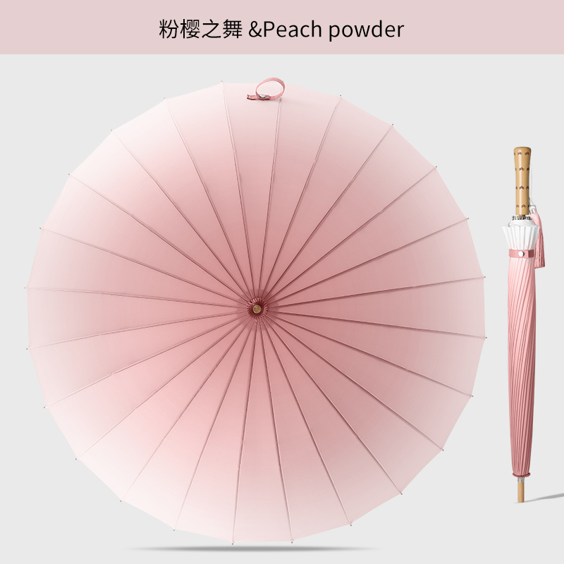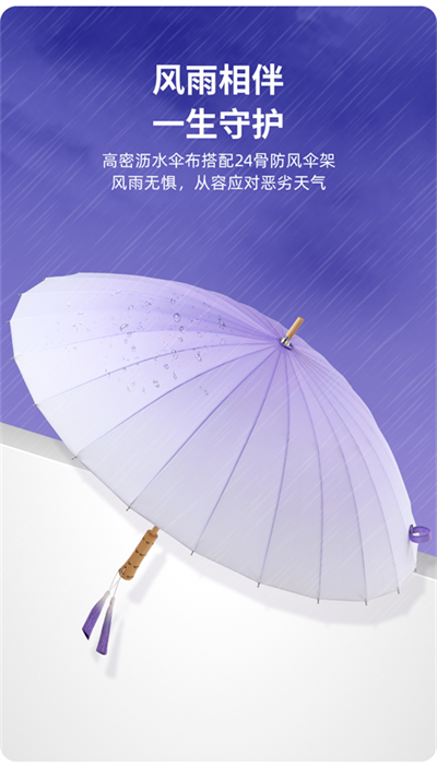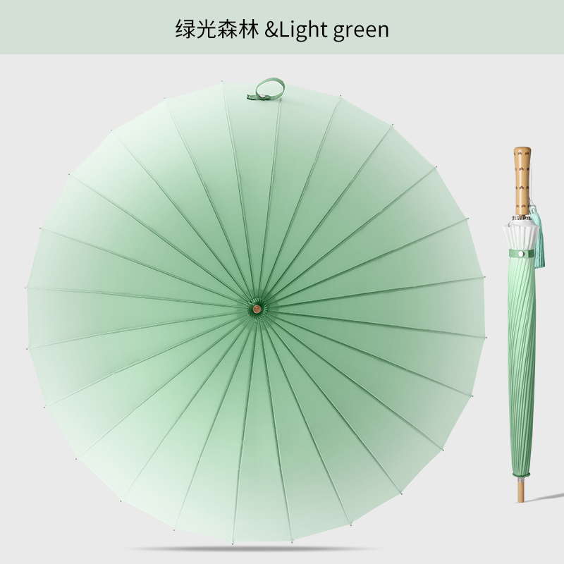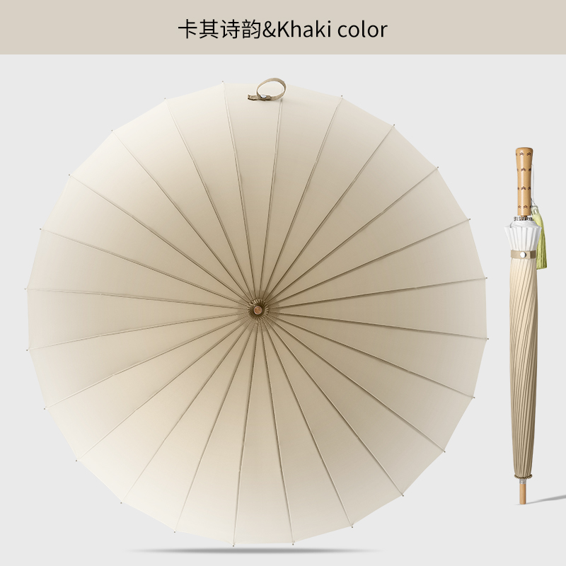 Product Name: 24-Rib Traditional Style Umbrella Frame: Fiberglass ribs, bamboo central shaft Canopy: 210T pongee fabric Handle: Straight wooden handle with strap Size: 535*24k Diameter when open: 95 CM Packaging: Individual cloth sleeve, OPP bag Quantity per carton: 40 pcs/carton Carton dimensions: 95*27*27 CM Weight per umbrella: 0.51 KG Net/Gross weight per carton: 21 KG / 22 KG
