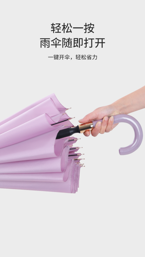 Product Name: 8-Rib Automatic Straight Umbrella Frame: Fiberglass ribs, iron central shaft Canopy: 280T pongee fabric Handle: Color-matched rubber-coated handle Specification: 685*8K Diameter under umbrella: 125CM Packaging: Single fabric sleeve, OPP bag Quantity per carton: 40 pieces/carton Carton size: 105*27*27CM Weight per umbrella: 0.65KG Net/Gross weight per carton: 26KG/27KG