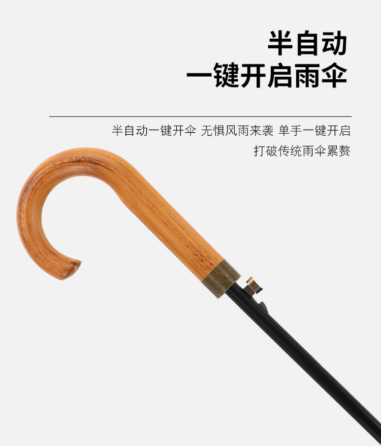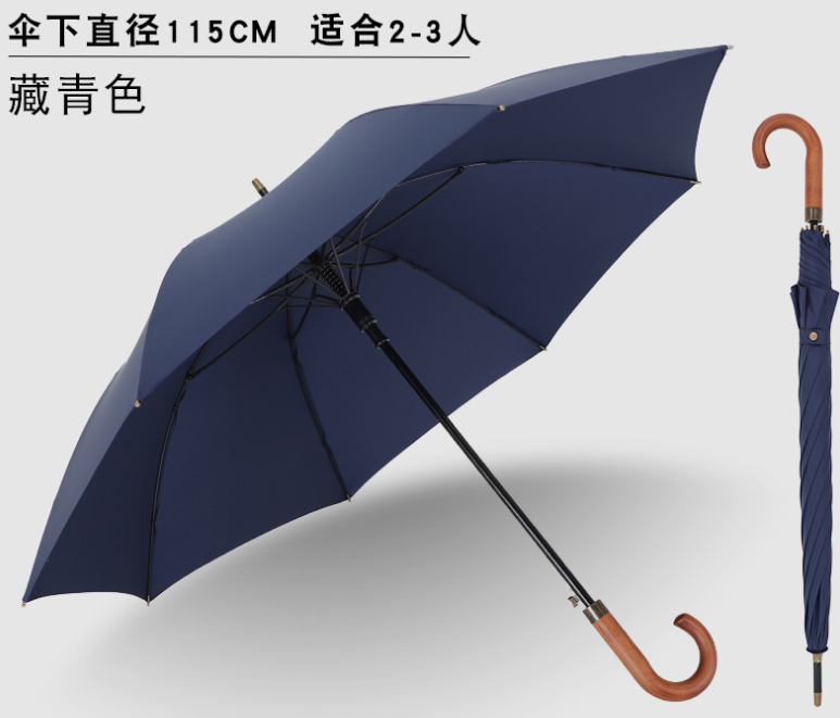 Product Name: 8-Rib Wooden Curved Handle Straight Umbrella Frame: Fiberglass ribs, iron center shaft Canopy: 210T pongee fabric Handle: Wooden curved handle Specification: 635*8K Diameter under umbrella: 113CM Packaging: Snap-on fabric cover, OPP packaging Quantity per carton: 50 pcs/carton Carton size: 95*27*27CM Weight per umbrella: 0.6KG Net/Gross weight per carton: 24KG/25KG