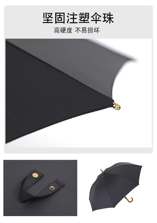 Product Name: 16-rib Wooden Straight Handle Umbrella Frame: Fiberglass ribs, iron central shaft Canopy: Black coated fabric Handle: Wooden straight handle Specification: 685*16K Umbrella Diameter: 123CM Packaging: Individual fabric sleeve, OPP packaging Quantity per Box: 50 pieces/box Box Dimensions: 95*27*27CM Weight per Umbrella: 0.6KG Net/Gross Weight per Box: 24KG/25KG