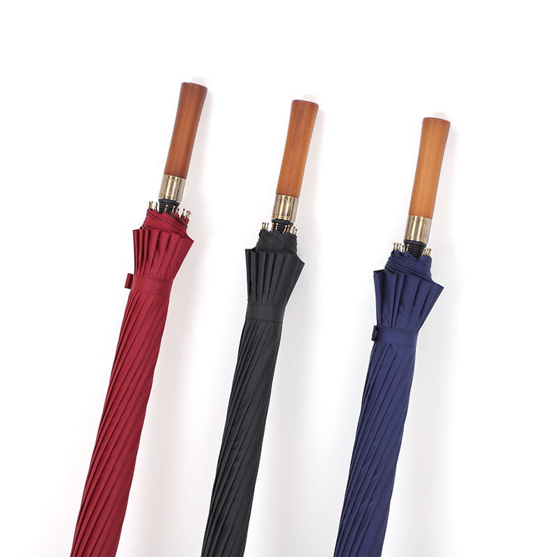 Product Name: 16-rib Wooden Straight Handle Umbrella Frame: Fiberglass ribs, iron central shaft Canopy: Black coated fabric Handle: Wooden straight handle Specification: 685*16K Umbrella Diameter: 123CM Packaging: Individual fabric sleeve, OPP packaging Quantity per Box: 50 pieces/box Box Dimensions: 95*27*27CM Weight per Umbrella: 0.6KG Net/Gross Weight per Box: 24KG/25KG