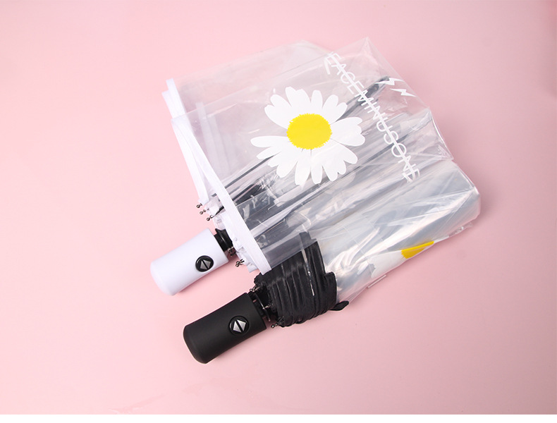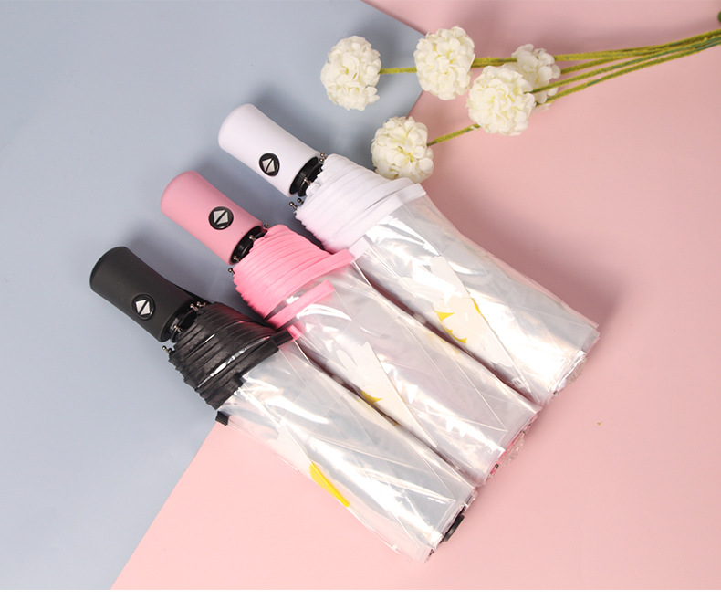 Name: Three-Fold Automatic Frame: Steel frame Canopy: Black coated fabric Handle: Rubber paint Specifications: 54*8, canopy diameter 95cm, folded length 16cm Packaging: Same-color cloth cover, matte bag packaging Quantity: 60 pieces/box Box dimensions: 48*30*28 cm Gross weight: 18KG