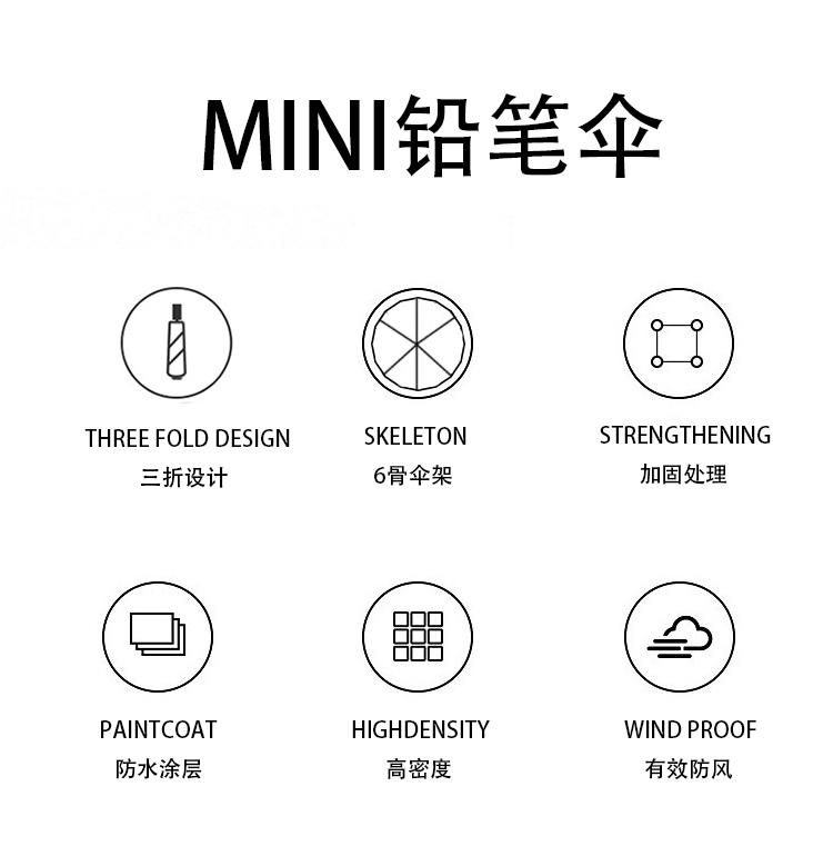 Name: Three-Fold Automatic Frame: Steel frame Canopy: Black coated fabric Handle: Rubber paint Specifications: 54*8, canopy diameter 95cm, folded length 16cm Packaging: Same-color cloth cover, matte bag packaging Quantity: 60 pieces/box Box dimensions: 48*30*28 cm Gross weight: 18KG