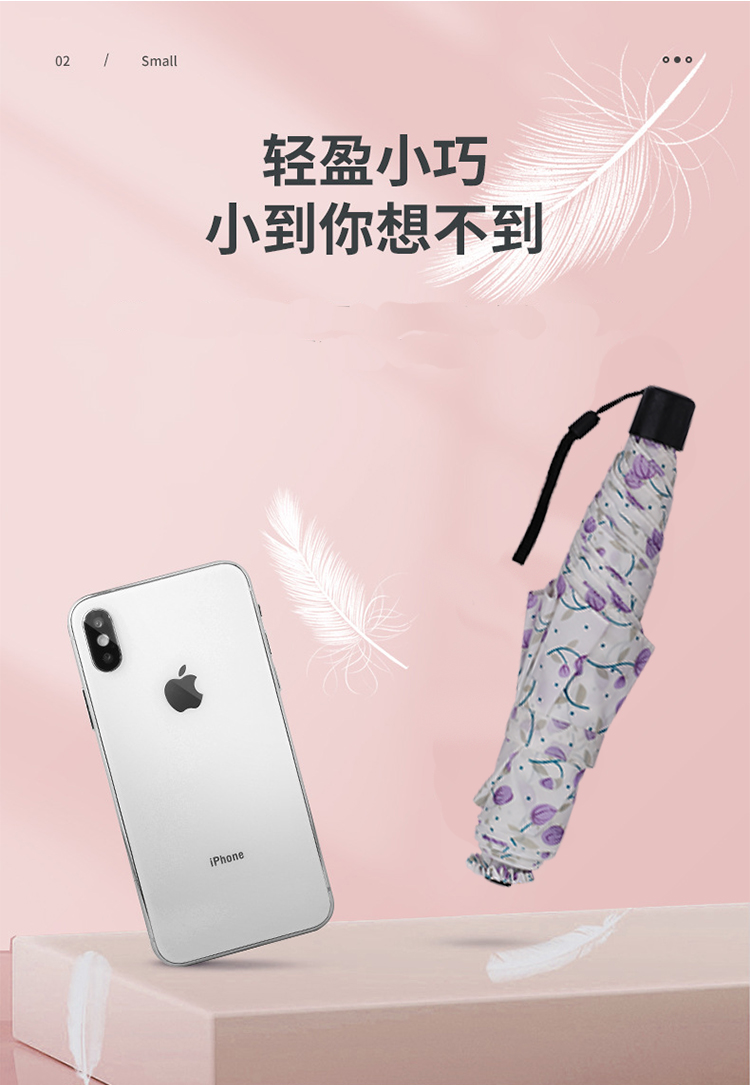 Name: Three-Fold Manual Umbrella Frame: Steel frame, fiber Canopy: Black rubberized fabric Handle: Rubber coating Specifications: 54*6, diameter under umbrella 90cm, folded length 22cm Packaging: Matching fabric sleeve, frosted bag packaging Quantity: 60 pieces per box Box dimensions: 48*30*28 cm Gross weight: 18KG
