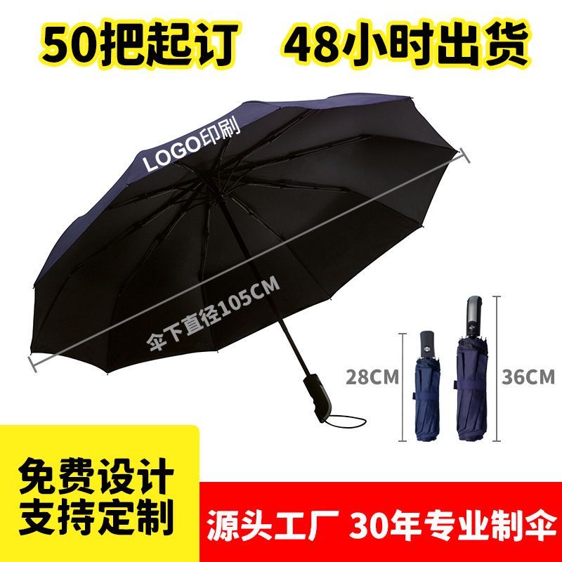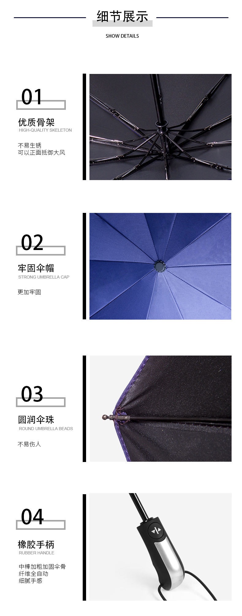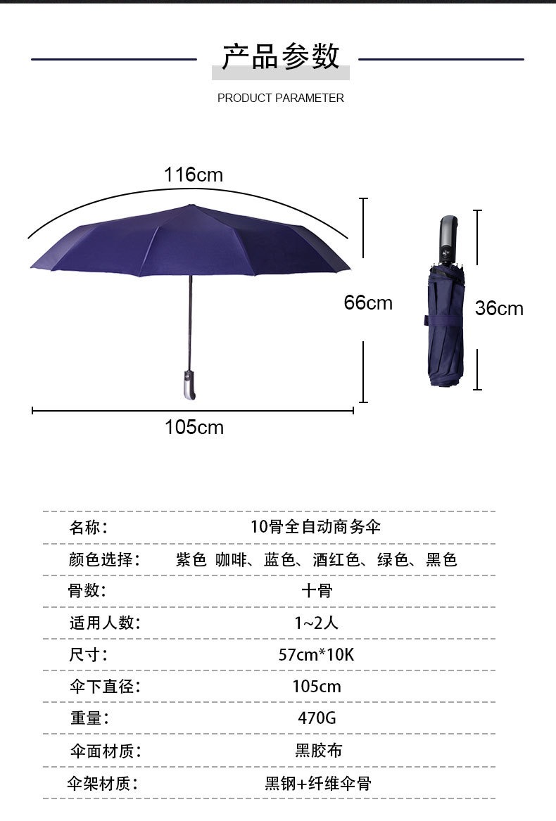 Name: 10-Rib Automatic 280T Frame: Aluminum Alloy Fiberglass Frame Fabric: 280T Pongee Fabric Handle: Rubber Paint Specification: 58.5*10 Umbrella Diameter: 105cm, Folded Length: 32cm Packaging: Zipper Bag with Matching Fabric Cover, Frosted Bag Packaging Quantity: 50 pieces/box Box Size: 45*35*30 Single Umbrella Packaging Size: 34*6.5*6.5 Weight: 0.42kg Gross Weight: 24.9kg
