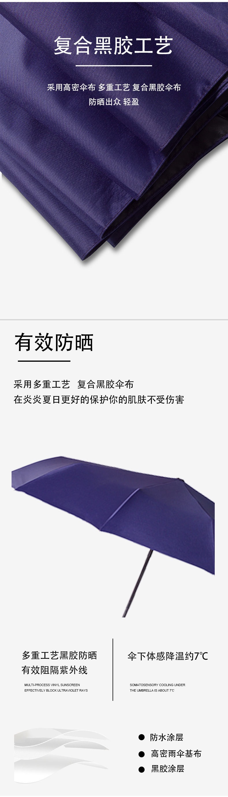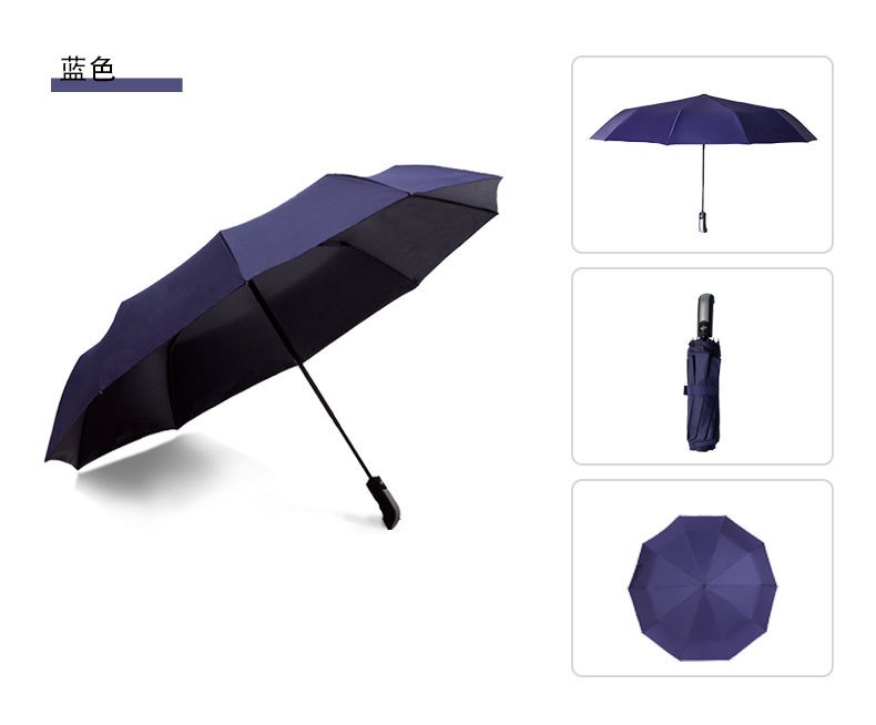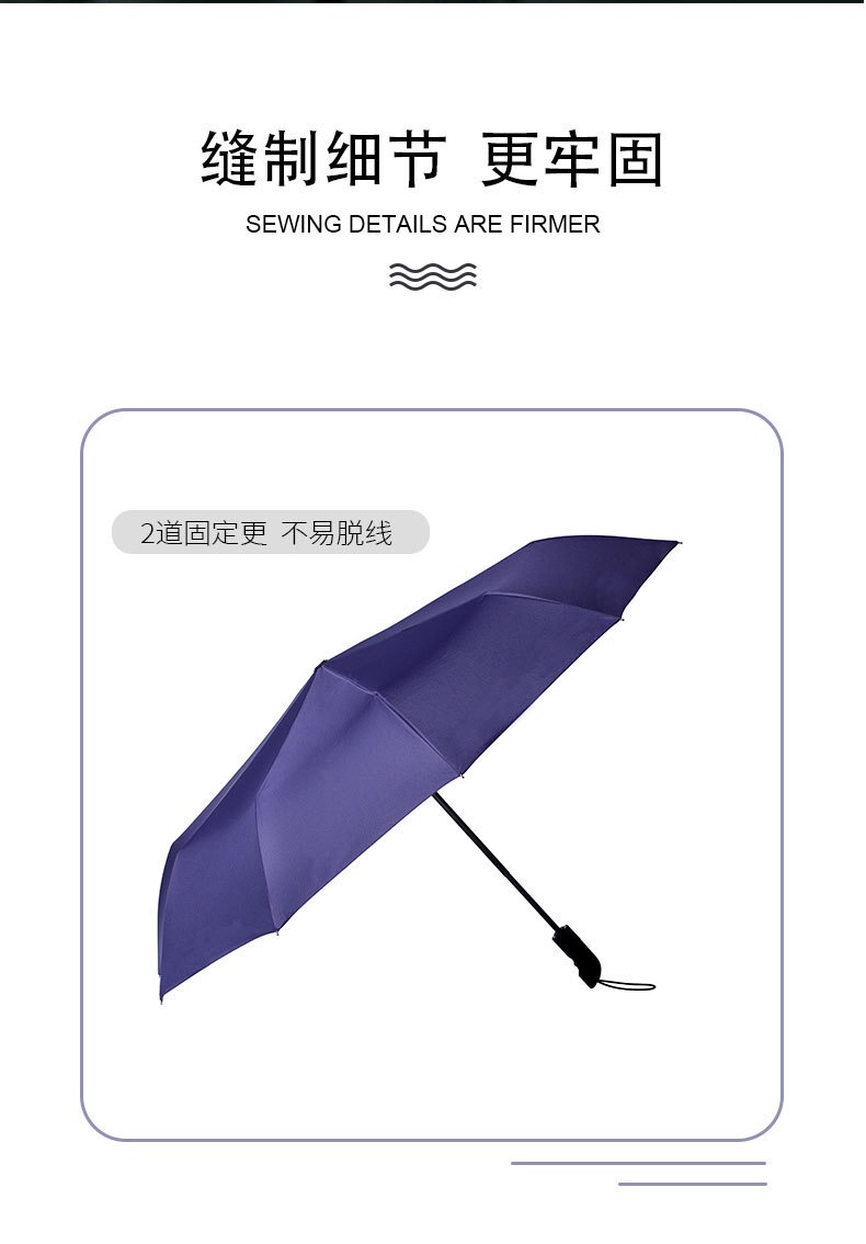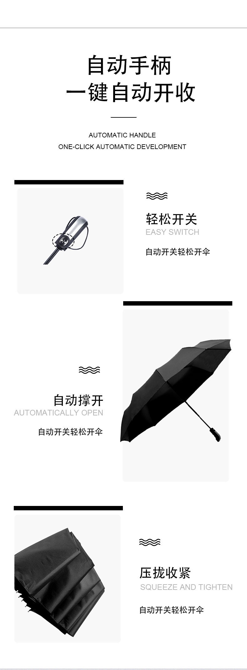 Name: Three-Fold Automatic Frame: Steel frame Canopy: Black coated fabric Handle: Rubber paint Specifications: 54*8, canopy diameter 95cm, folded length 16cm Packaging: Same-color cloth cover, matte bag packaging Quantity: 60 pieces/box Box dimensions: 48*30*28 cm Gross weight: 18KG