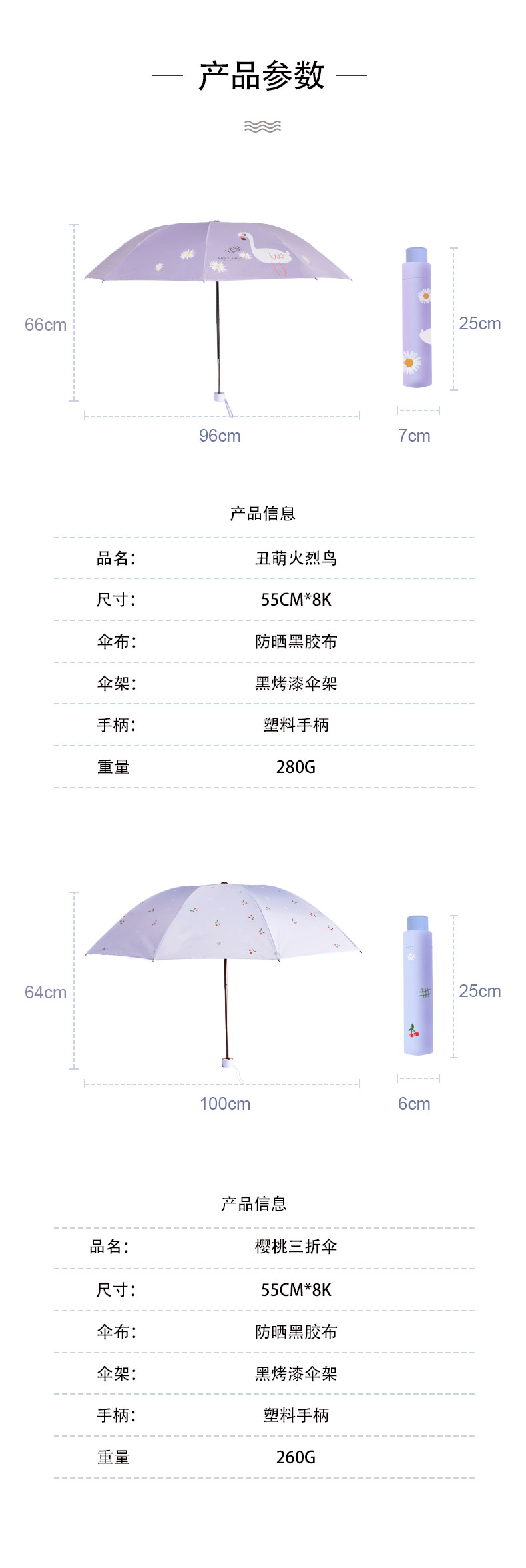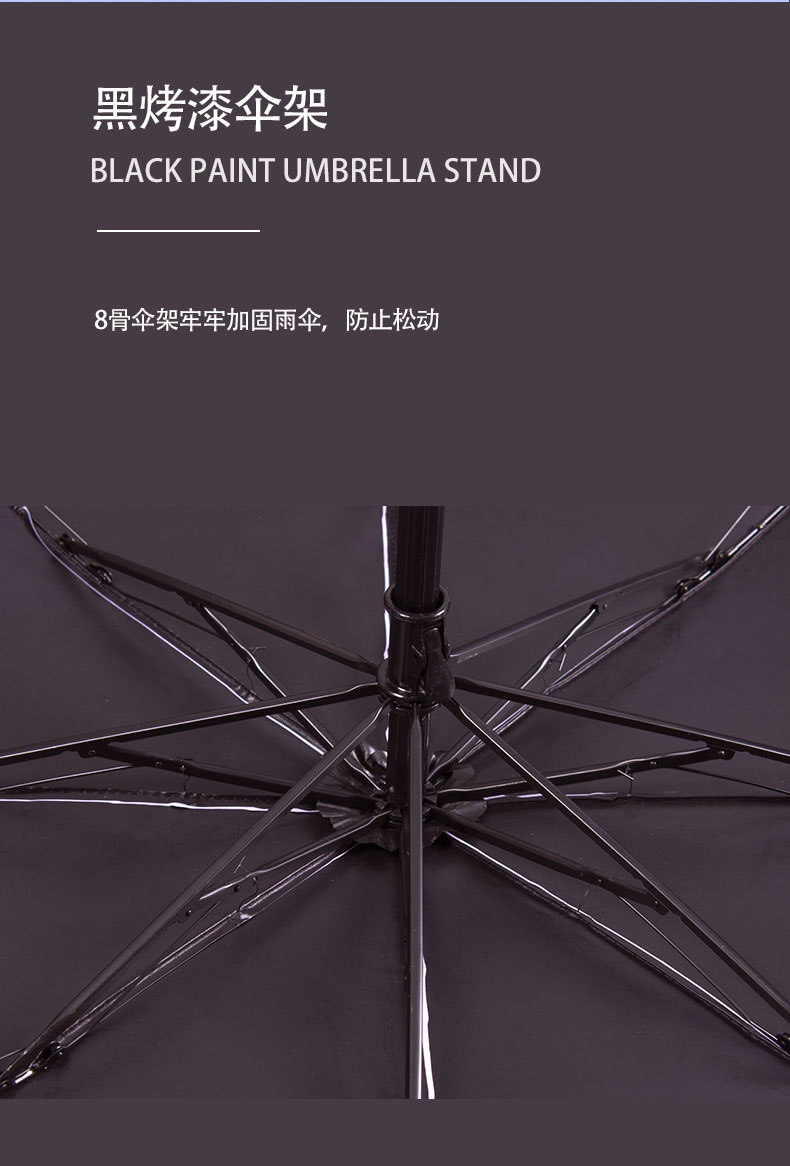 Name: Three-Fold Automatic Frame: Steel frame Canopy: Black coated fabric Handle: Rubber paint Specifications: 54*8, canopy diameter 95cm, folded length 16cm Packaging: Same-color cloth cover, matte bag packaging Quantity: 60 pieces/box Box dimensions: 48*30*28 cm Gross weight: 18KG