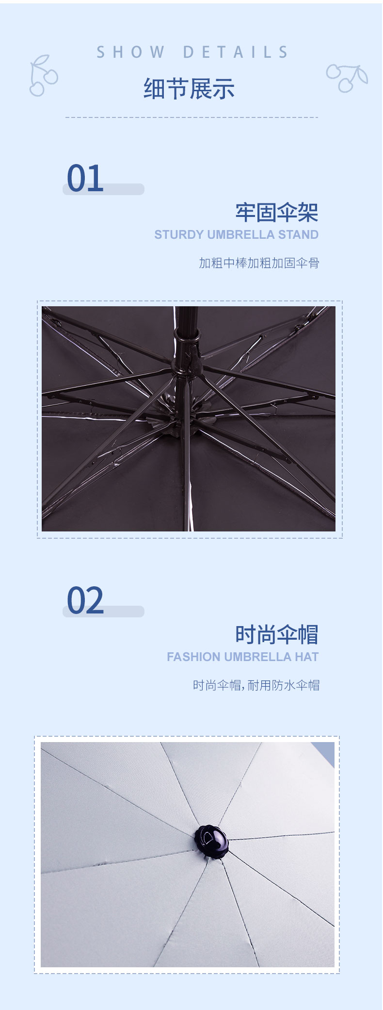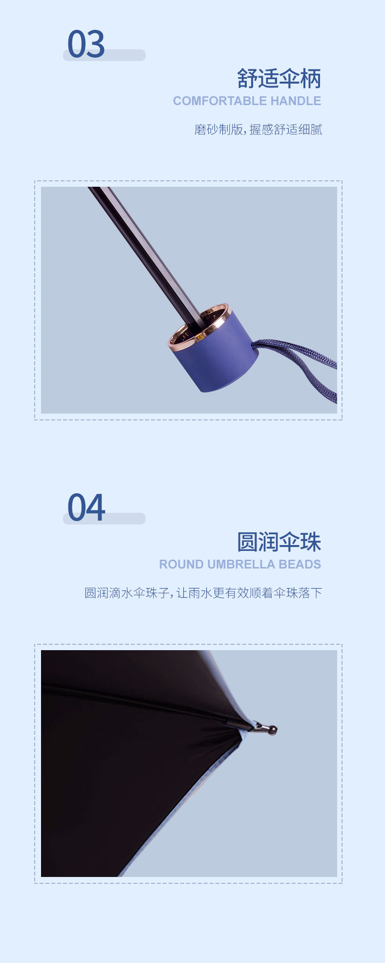 Name: Three-Fold Astronaut Umbrella Frame: Steel frame with fiber double ribs Canopy: Black-coated fabric Handle: Astronaut handle Size: 54*8 cm Diameter when open: 102 cm, Length when folded: 31 cm Packaging: Matching color fabric cover, OPP bag packaging Quantity: 60 pcs/box Box dimensions: 45/35/30 cm Gross weight: 17 kg
