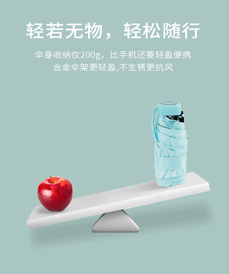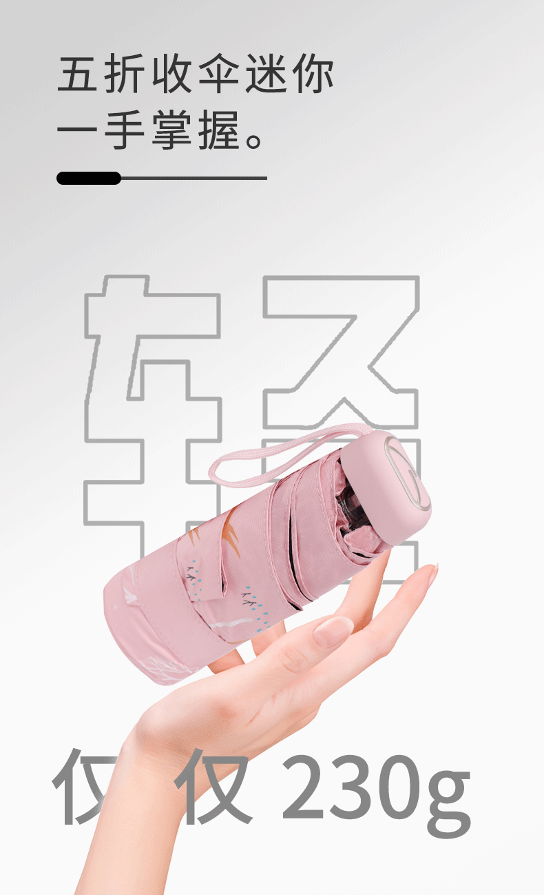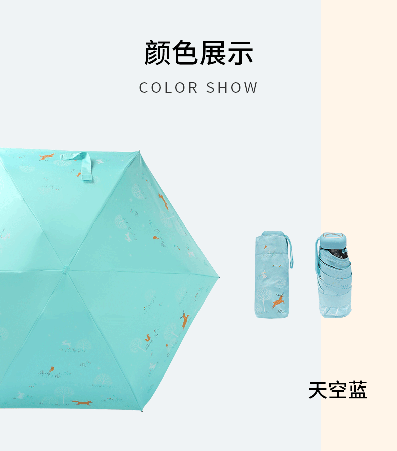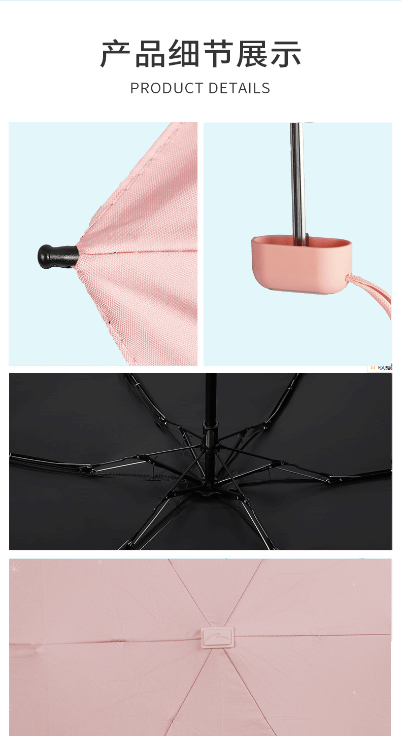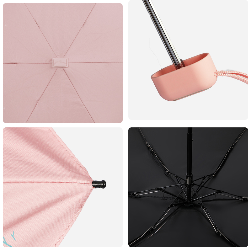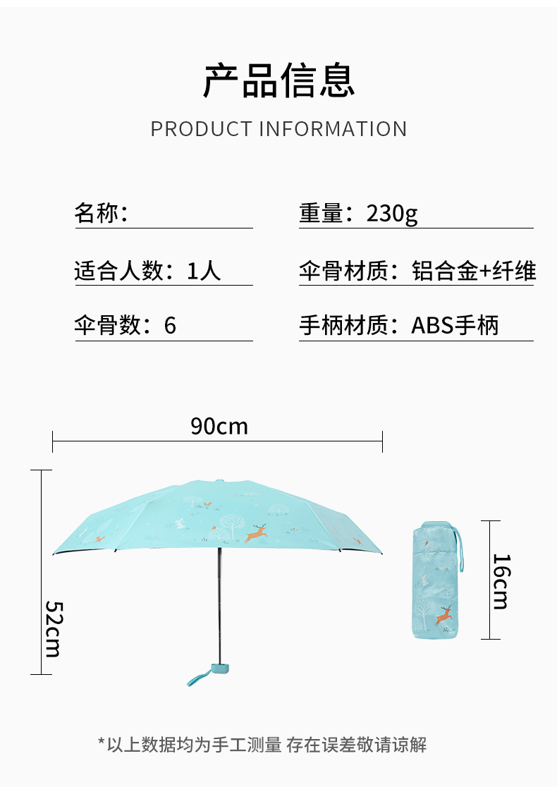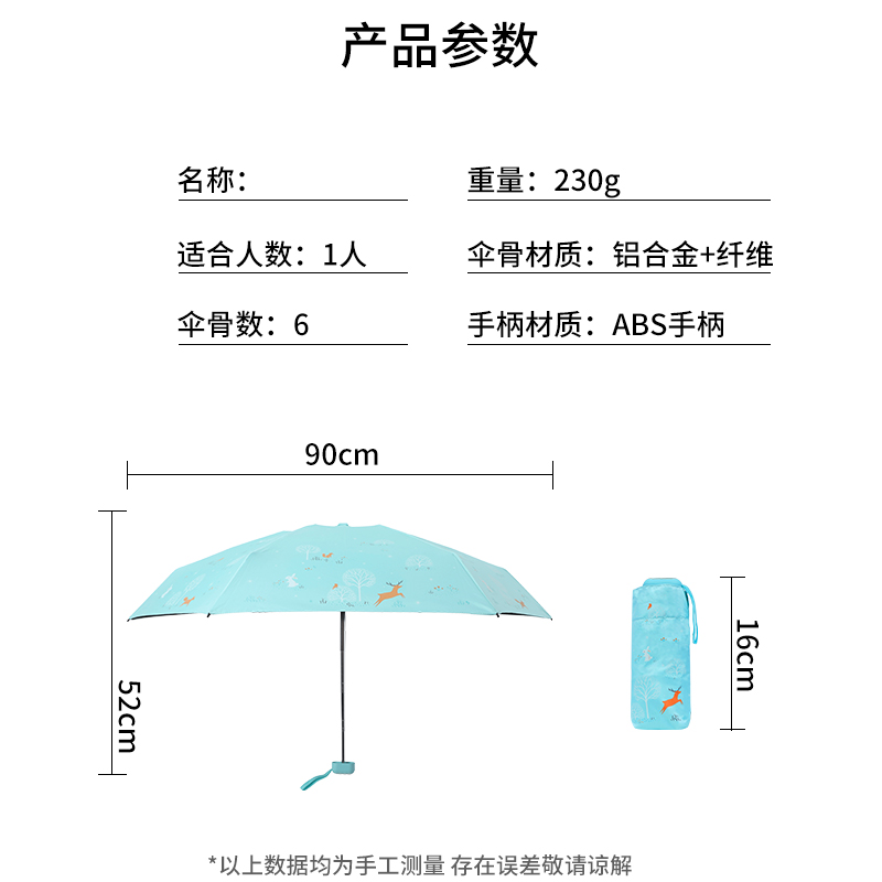 Name: 50% Off Six-Rib Black Coated Fabric Pocket Umbrella Frame: Black steel frame Canopy: Black coated fabric Handle: ABS Specifications: 50*6 ribs, diameter when open 95 cm, length when folded 18 cm Packaging: Matching color fabric cover, matte bag packaging Quantity: 100 pieces per box Box size: 45*35*30 cm Individual package size: 17.5*8.5*5.5 cm Weight: 0.23 kg Gross weight: 25 kg
