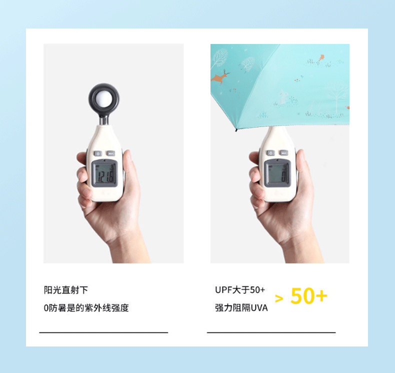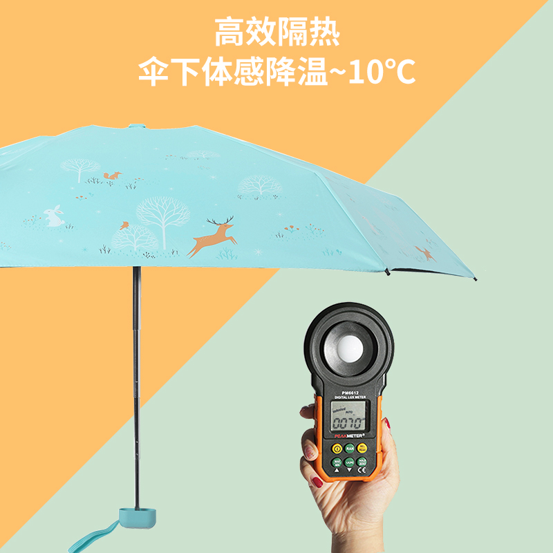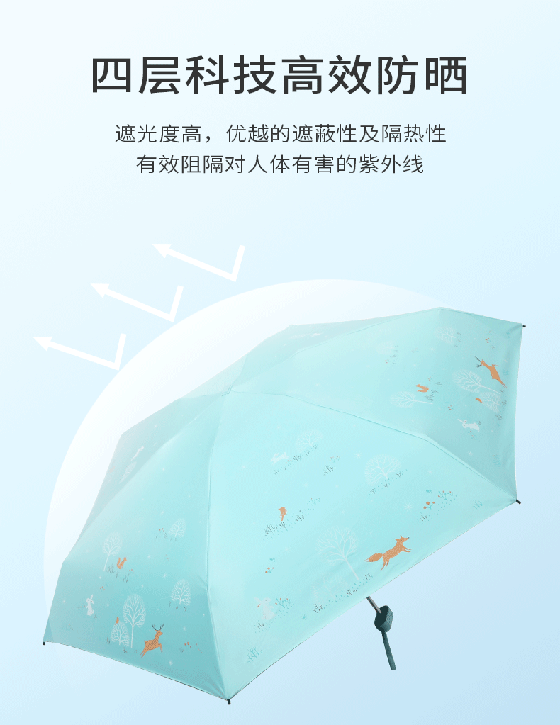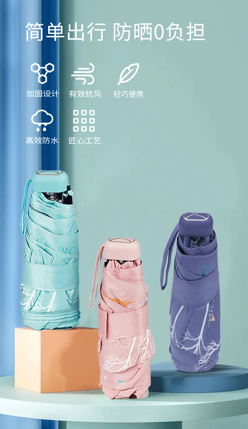 Name: Colorful Coated Five-Fold Umbrella Frame: Gold-colored aluminum alloy frame Canopy: Double-sided floral black coating fabric, semi-shading black coating Handle: Solid wood handle Specifications: 54*8, diameter under umbrella 96cm, folded length 18cm Packaging: Matching color fabric sleeve, bagged Quantity per box: 60 pieces/box Box dimensions: 50/32/30