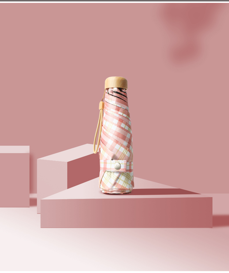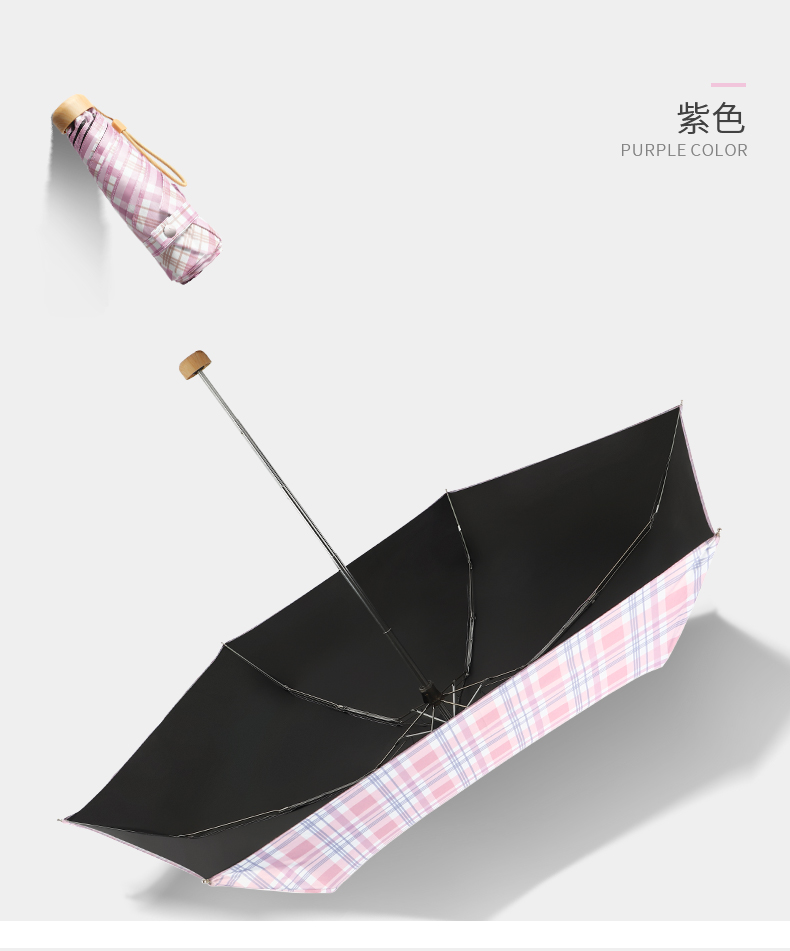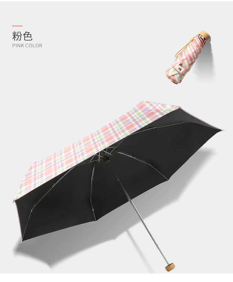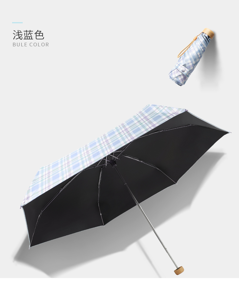 Name: Colorful Coated Five-Fold Umbrella Frame: Gold-colored aluminum alloy frame Canopy: Double-sided floral black coating fabric, semi-shading black coating Handle: Solid wood handle Specifications: 54*8, diameter under umbrella 96cm, folded length 18cm Packaging: Matching color fabric sleeve, bagged Quantity per box: 60 pieces/box Box dimensions: 50/32/30