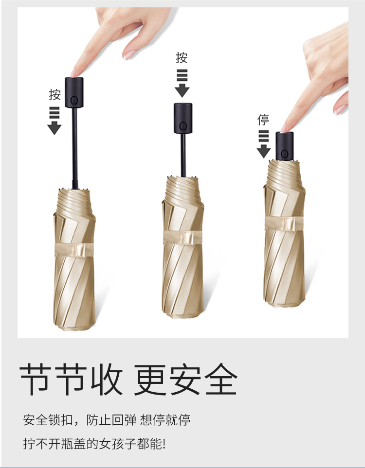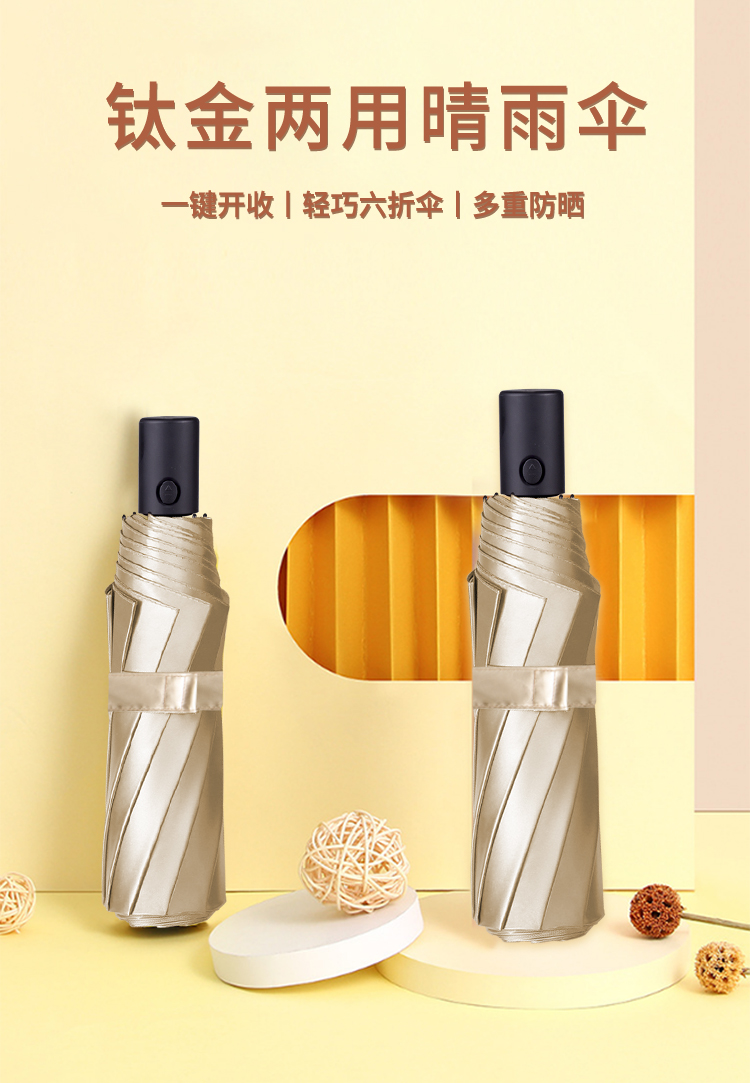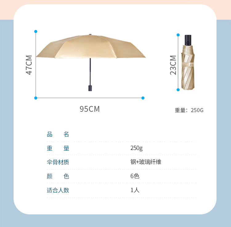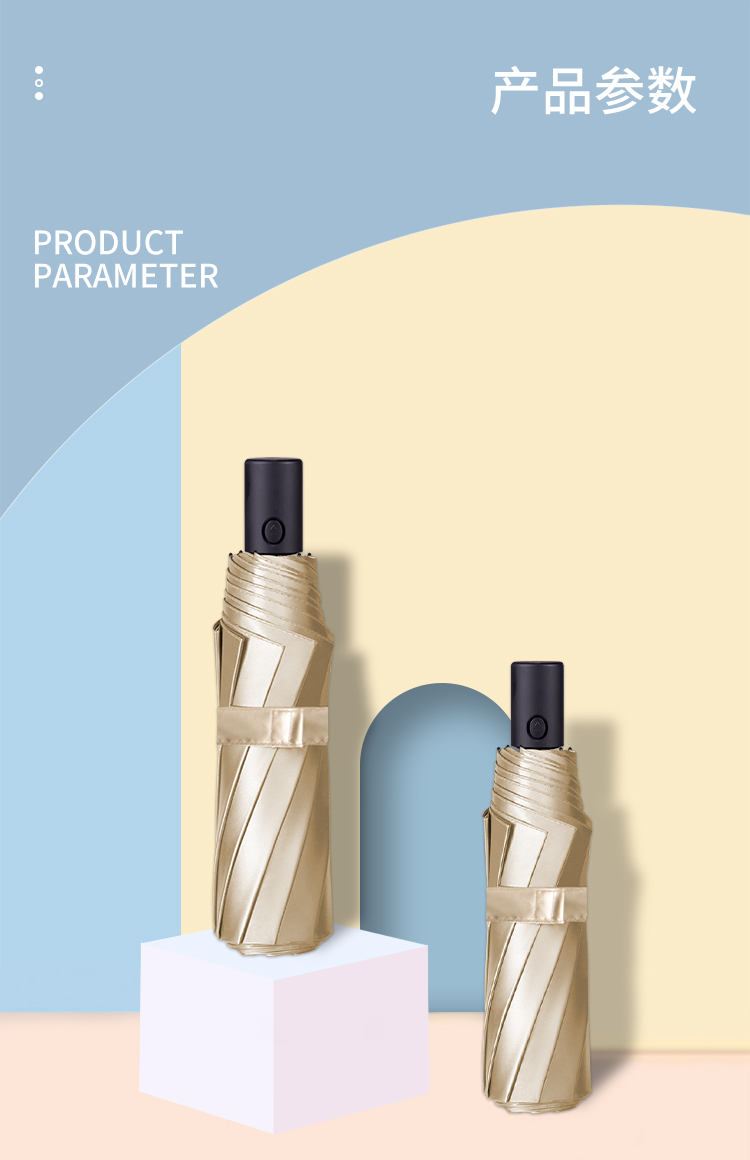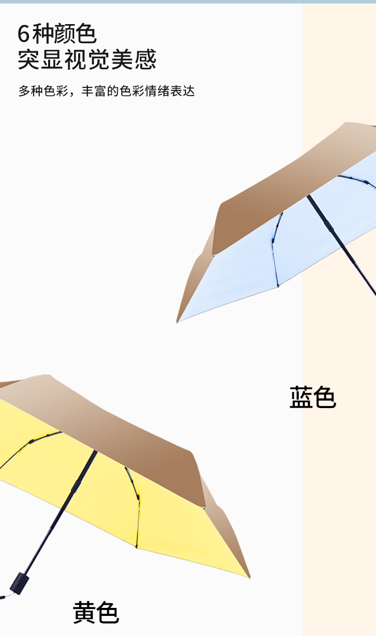 Name: 50% Off Six-Rib Black Coated Fabric Pocket Umbrella Frame: Black steel frame Canopy: Black coated fabric Handle: ABS Specifications: 50*6 ribs, diameter when open 95 cm, length when folded 18 cm Packaging: Matching color fabric cover, matte bag packaging Quantity: 100 pieces per box Box size: 45*35*30 cm Individual package size: 17.5*8.5*5.5 cm Weight: 0.23 kg Gross weight: 25 kg
