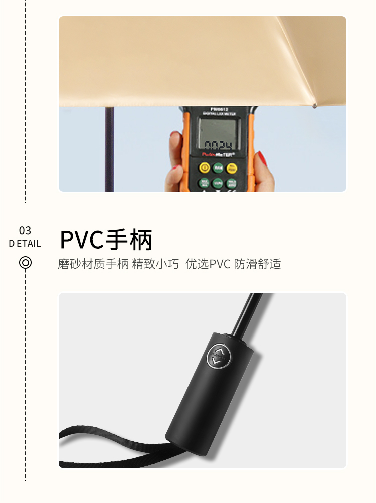 Name: 50% Fold Ring Handle Umbrella Frame: Black steel frame Canopy: Thickened colored PVC Handle: Rubber paint Size: 52*6K Diameter under umbrella: 90 cm, folded length: 18 cm Packaging: Same color fabric cover with bag Quantity: 60 pieces/box Carton size: 48*35*26 cm