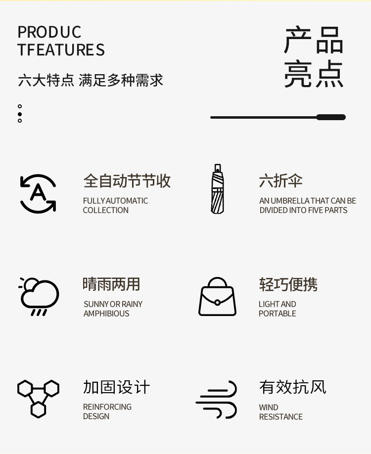 Name: 60% Off Color Scheme Frame: Black steel frame Canopy: Black coated fabric Handle: ABS Specification: 50*6K Diameter under umbrella (cm), length when folded (cm) Packaging: Same color fabric sleeve, bag packaging Quantity: 60 pieces/box Box dimensions: 48/28/30