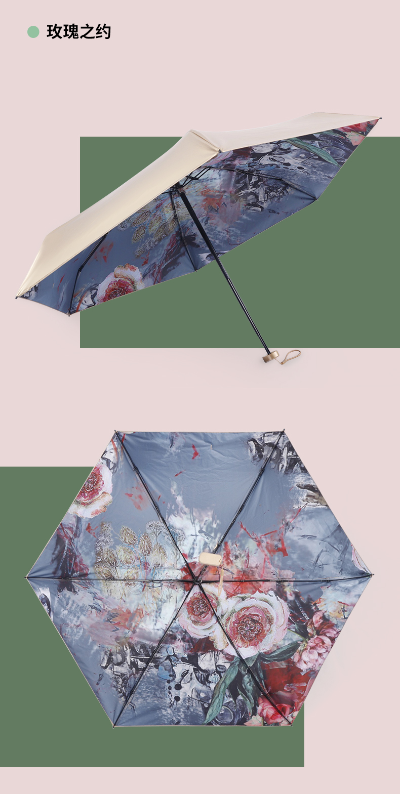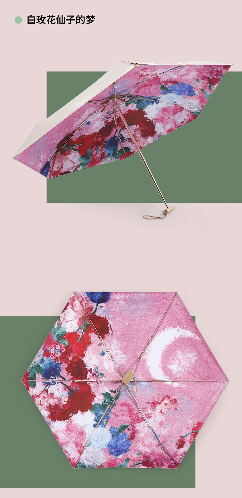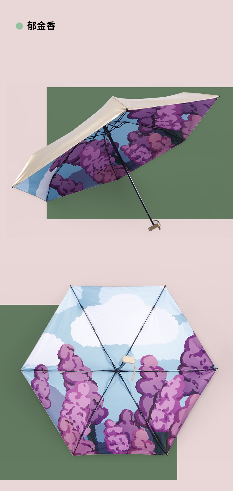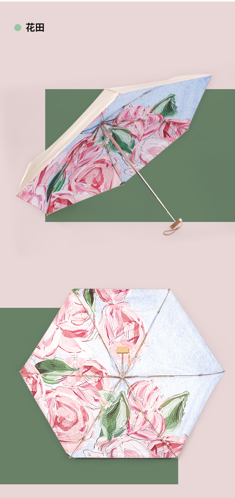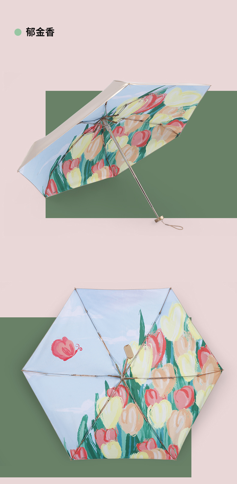 Name: Colorful Coated Five-Fold Umbrella Frame: Gold-colored aluminum alloy frame Canopy: Double-sided floral black coating fabric, semi-shading black coating Handle: Solid wood handle Specifications: 54*8, diameter under umbrella 96cm, folded length 18cm Packaging: Matching color fabric sleeve, bagged Quantity per box: 60 pieces/box Box dimensions: 50/32/30