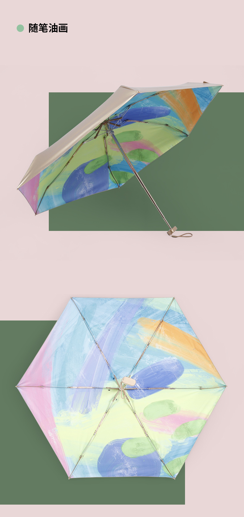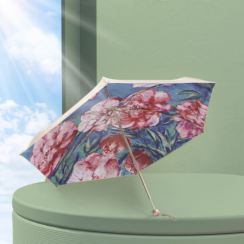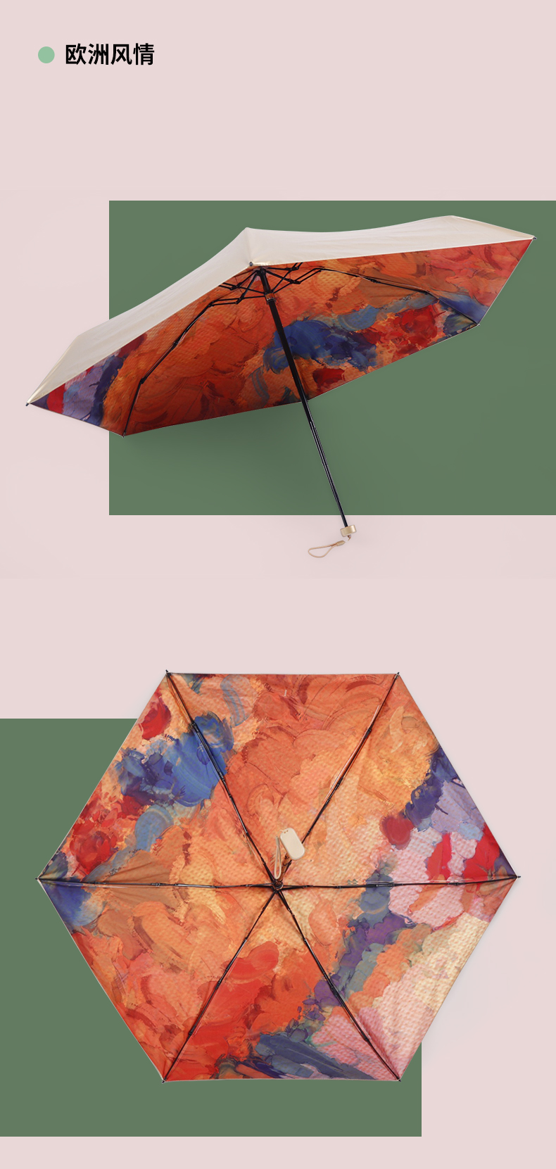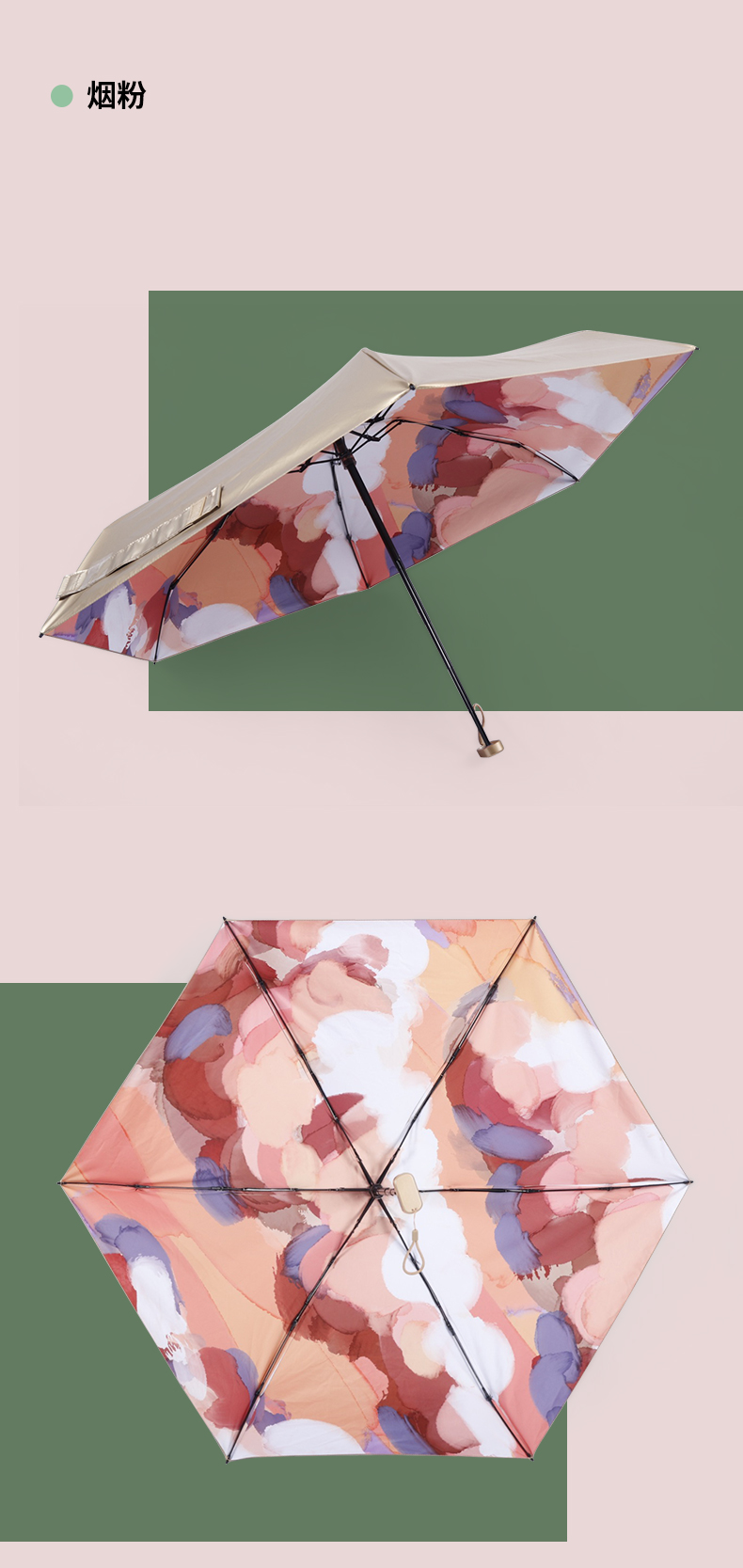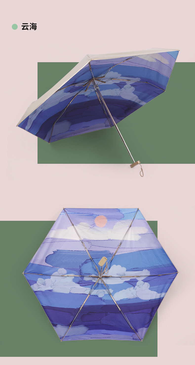 Name: Colorful Coated Five-Fold Umbrella Frame: Gold-colored aluminum alloy frame Canopy: Double-sided floral black coating fabric, semi-shading black coating Handle: Solid wood handle Specifications: 54*8, diameter under umbrella 96cm, folded length 18cm Packaging: Matching color fabric sleeve, bagged Quantity per box: 60 pieces/box Box dimensions: 50/32/30
