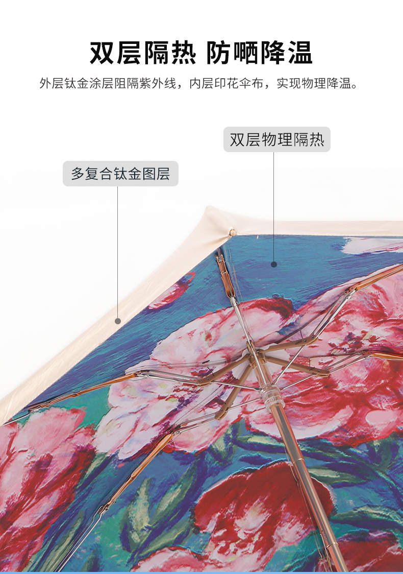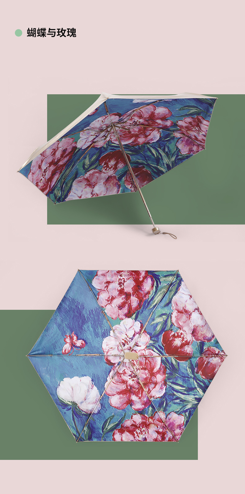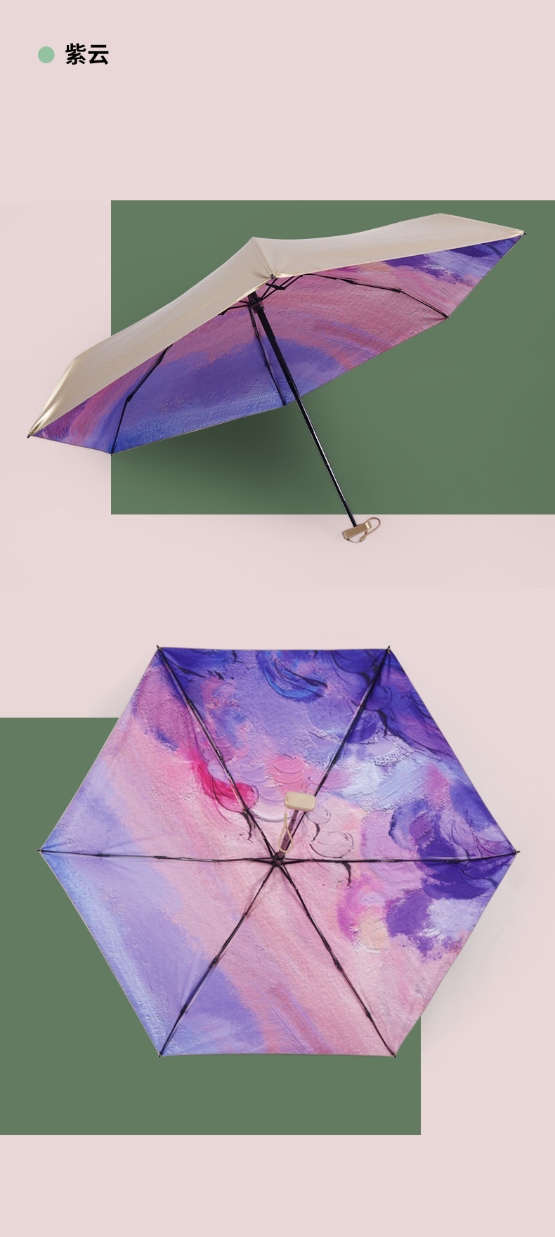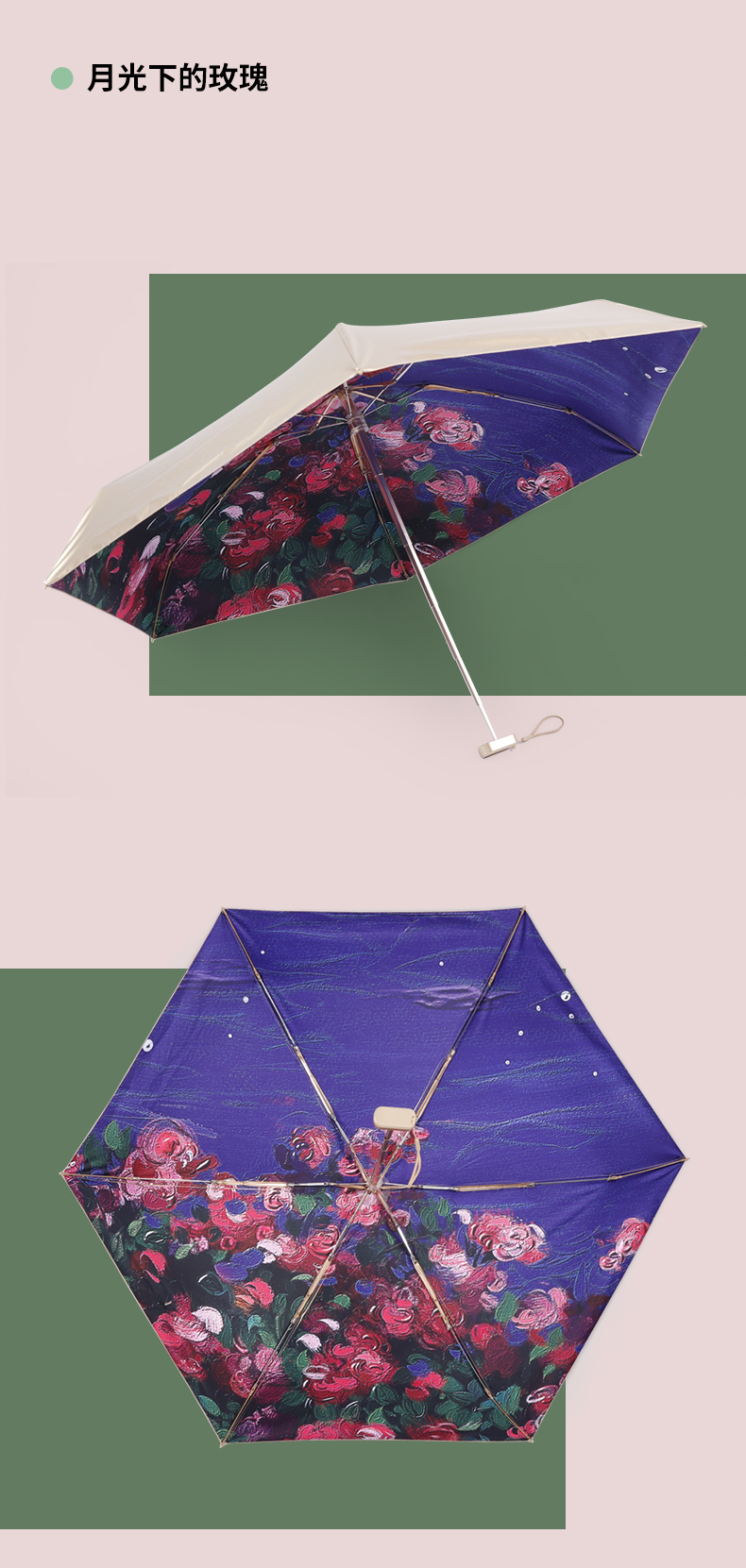 Name: Colorful Coated Five-Fold Umbrella Frame: Gold-colored aluminum alloy frame Canopy: Double-sided floral black coating fabric, semi-shading black coating Handle: Solid wood handle Specifications: 54*8, diameter under umbrella 96cm, folded length 18cm Packaging: Matching color fabric sleeve, bagged Quantity per box: 60 pieces/box Box dimensions: 50/32/30