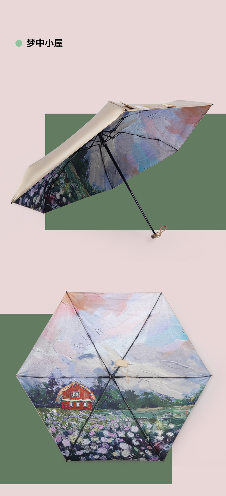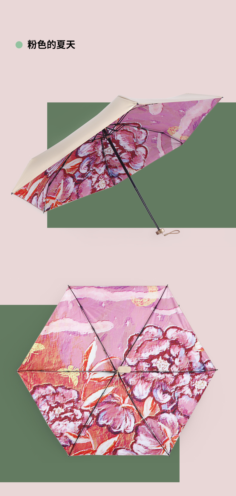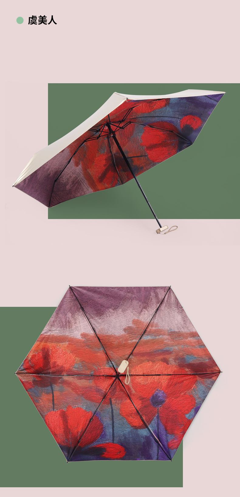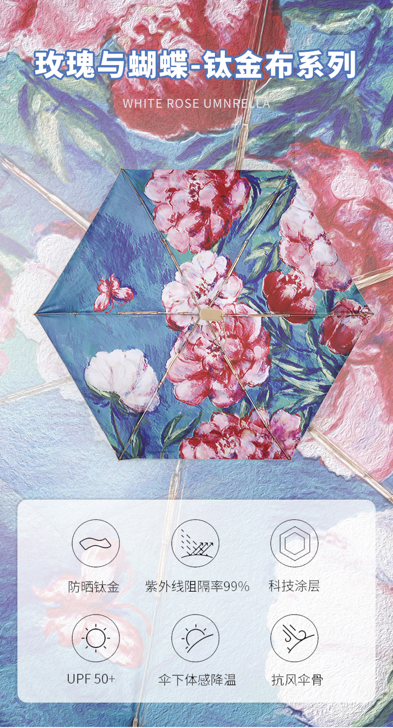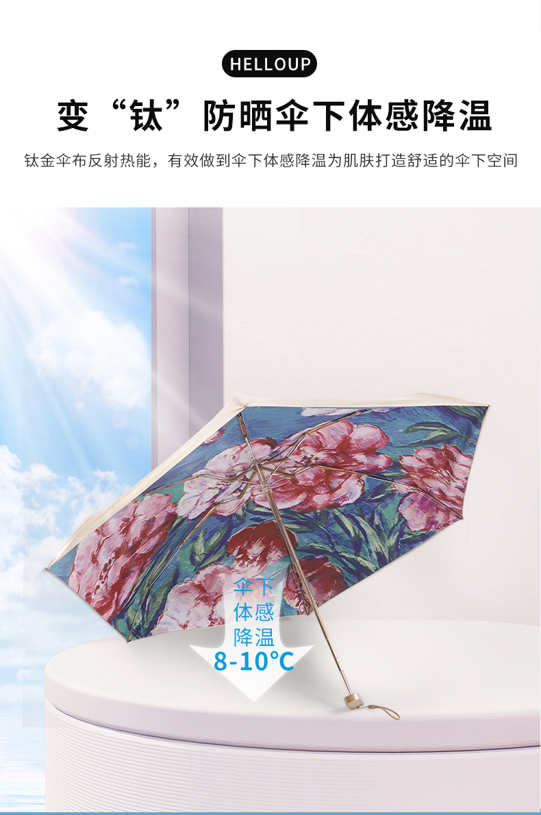 Name: Colorful Coated Five-Fold Umbrella Frame: Gold-colored aluminum alloy frame Canopy: Double-sided floral black coating fabric, semi-shading black coating Handle: Solid wood handle Specifications: 54*8, diameter under umbrella 96cm, folded length 18cm Packaging: Matching color fabric sleeve, bagged Quantity per box: 60 pieces/box Box dimensions: 50/32/30