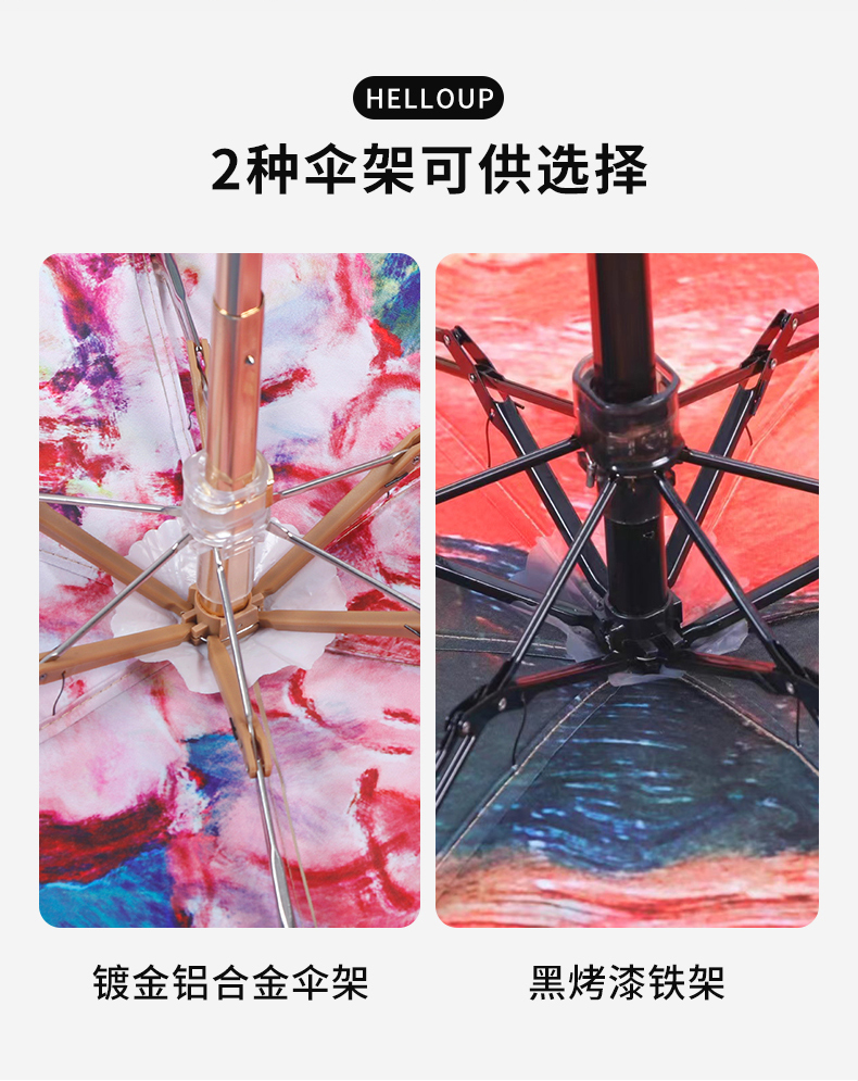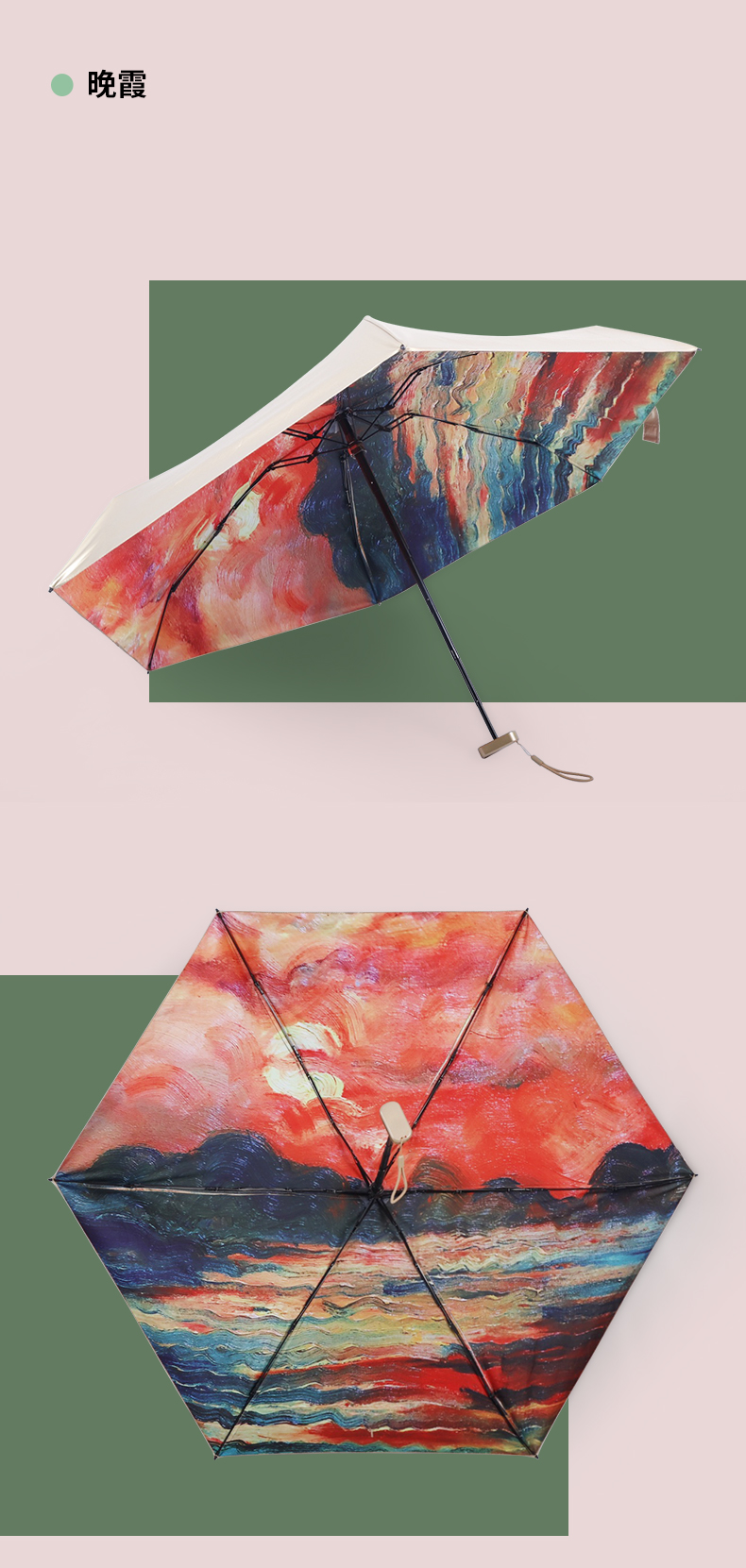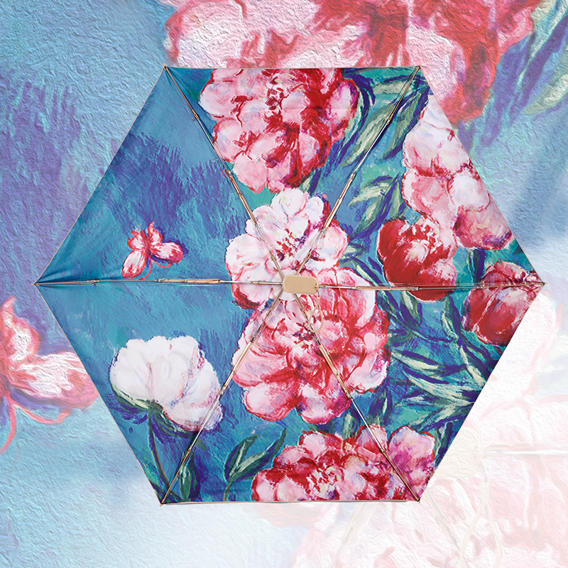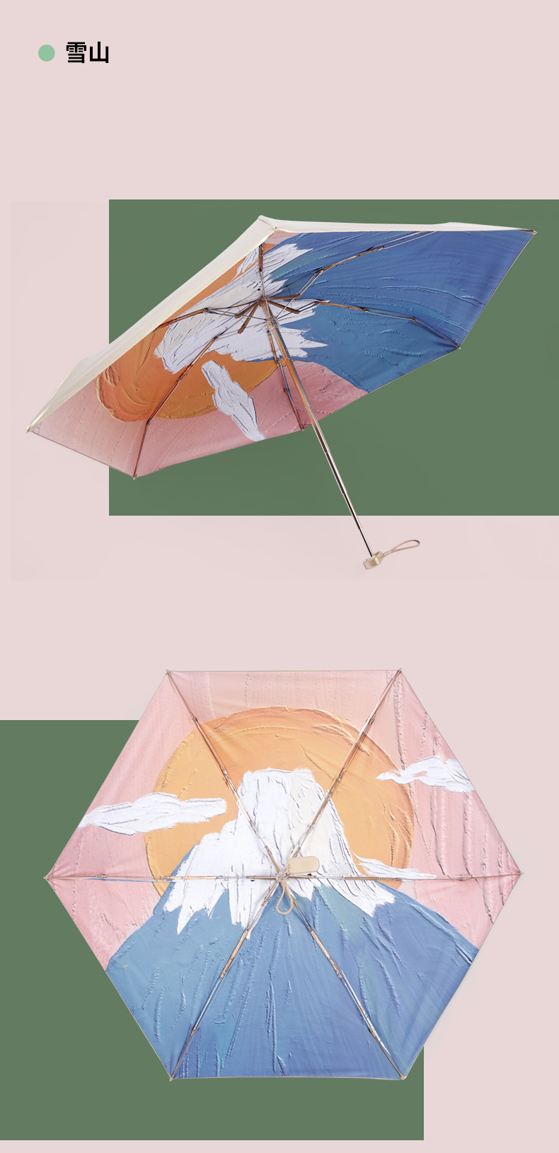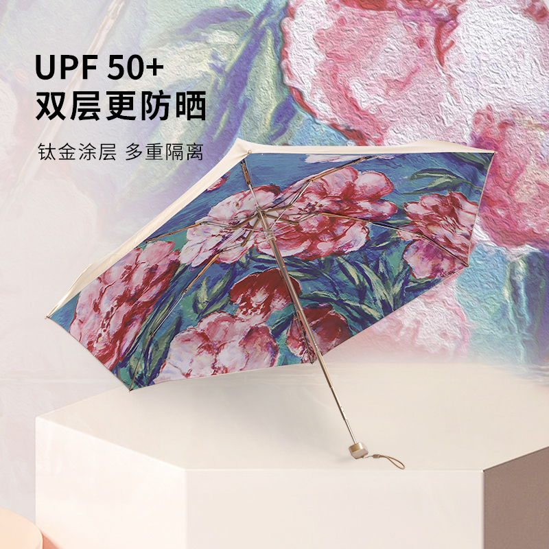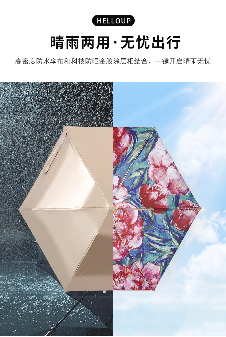 Name: Colorful Coated Five-Fold Umbrella Frame: Gold-colored aluminum alloy frame Canopy: Double-sided floral black coating fabric, semi-shading black coating Handle: Solid wood handle Specifications: 54*8, diameter under umbrella 96cm, folded length 18cm Packaging: Matching color fabric sleeve, bagged Quantity per box: 60 pieces/box Box dimensions: 50/32/30